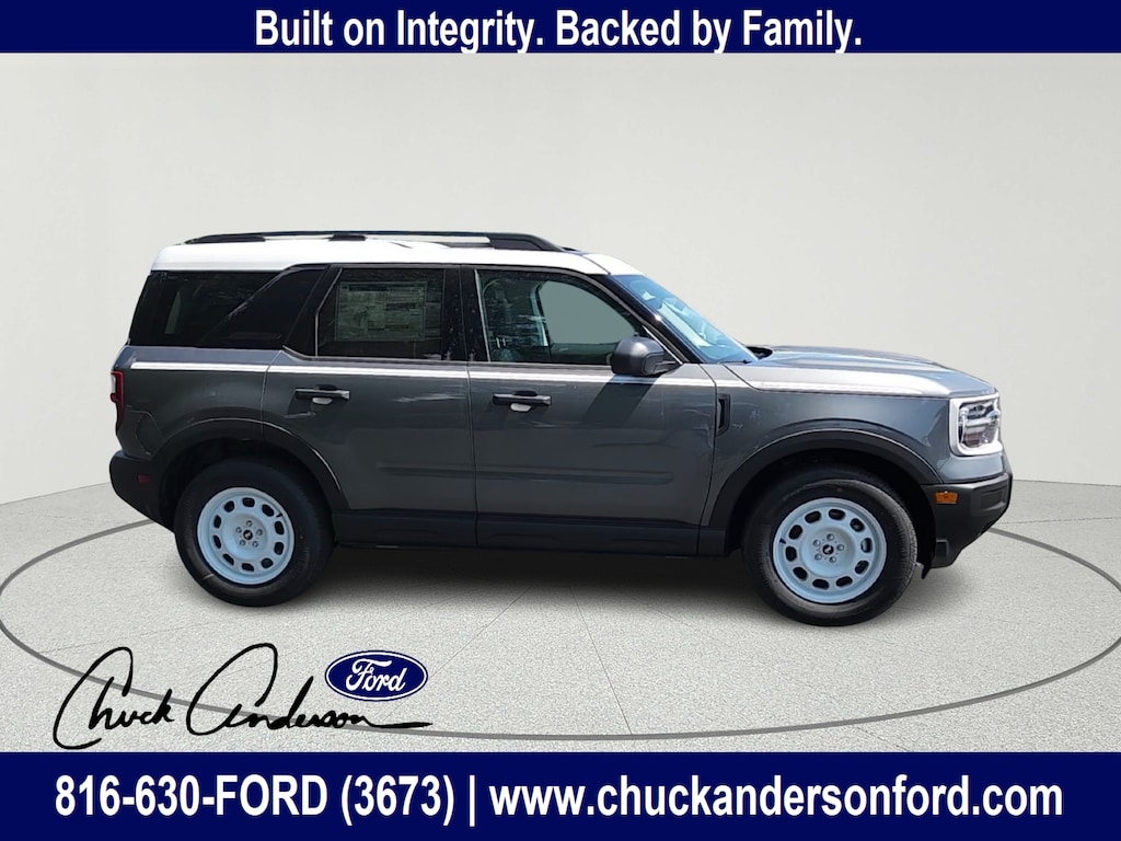 Step into classic Bronco style with modern capability in this Carbonized Gray Metallic 2025 Ford Bronco Sport Heritage 4WD, now on sale at Chuck Anderson Ford in Excelsior Springs, Missouri! Designed for adventure and everyday practicality, this Bronco Sport Heritage combines off-road readiness with vintage-inspired details that turn heads across Kansas City, Liberty, Lawson, and Kearney, Missouri.